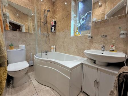 BATHROOM Obscure double glazed window to side, vertical radiator, shaped shower bath with mixer tap and thermostatic shower over, low level WC, pedestal hand-wash basin with mixer tap, stone effect tiled walls and floor, inset ceiling lights.