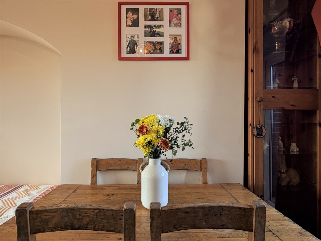 SITTING & DINING ROOM 9' 11" max. x 20' 9" approx. (3.02m x 6.32m) Dual aspect double glazed windows to rear and side, decorative borrow-light window through to hallway. two radiators, open nook fireplace with rustic timber mantle and log burner, television point, stripped traditional wood plank flooring, open timber framework, traditional doors to hallway and kitchen.