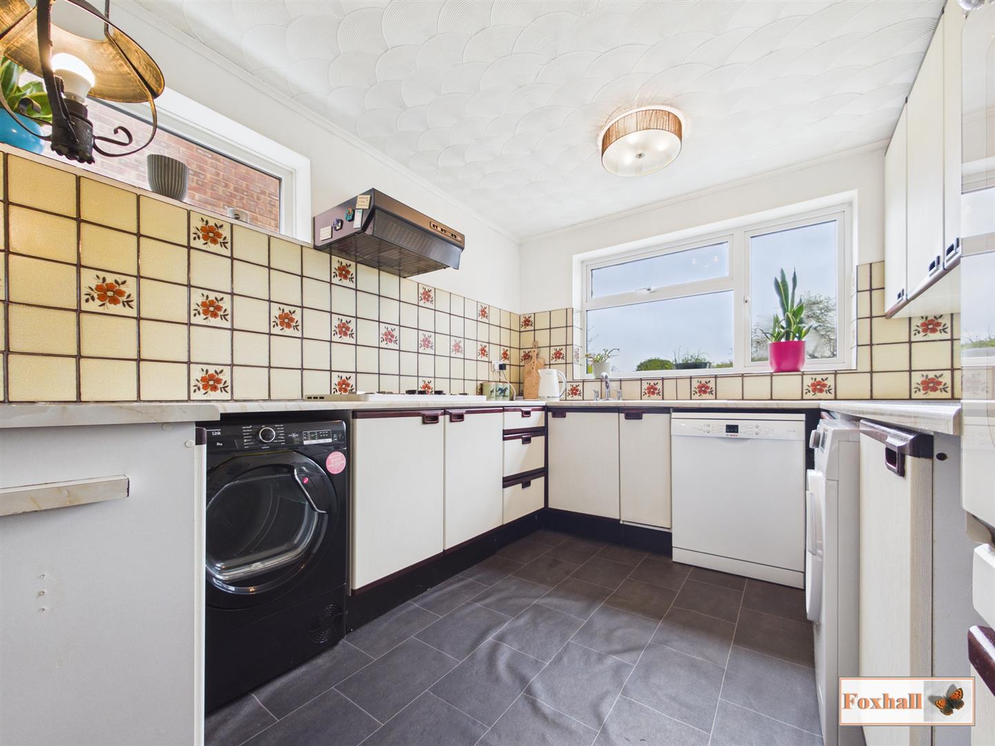 Kitchen - 4.84 x 2.65 (15'10" x 8'8") - Base and eye-level units with rolled edged worktops and tiled splashback, integrated electric oven, integrated gas hob with extractor over, integrated sink and drainer, integrated fridge, space for a washing machine, space for a dishwasher space for a tumble dryer, radiator, rear and side aspect double glazed windows, UPVC double glazed door into the garden and lino flooring.