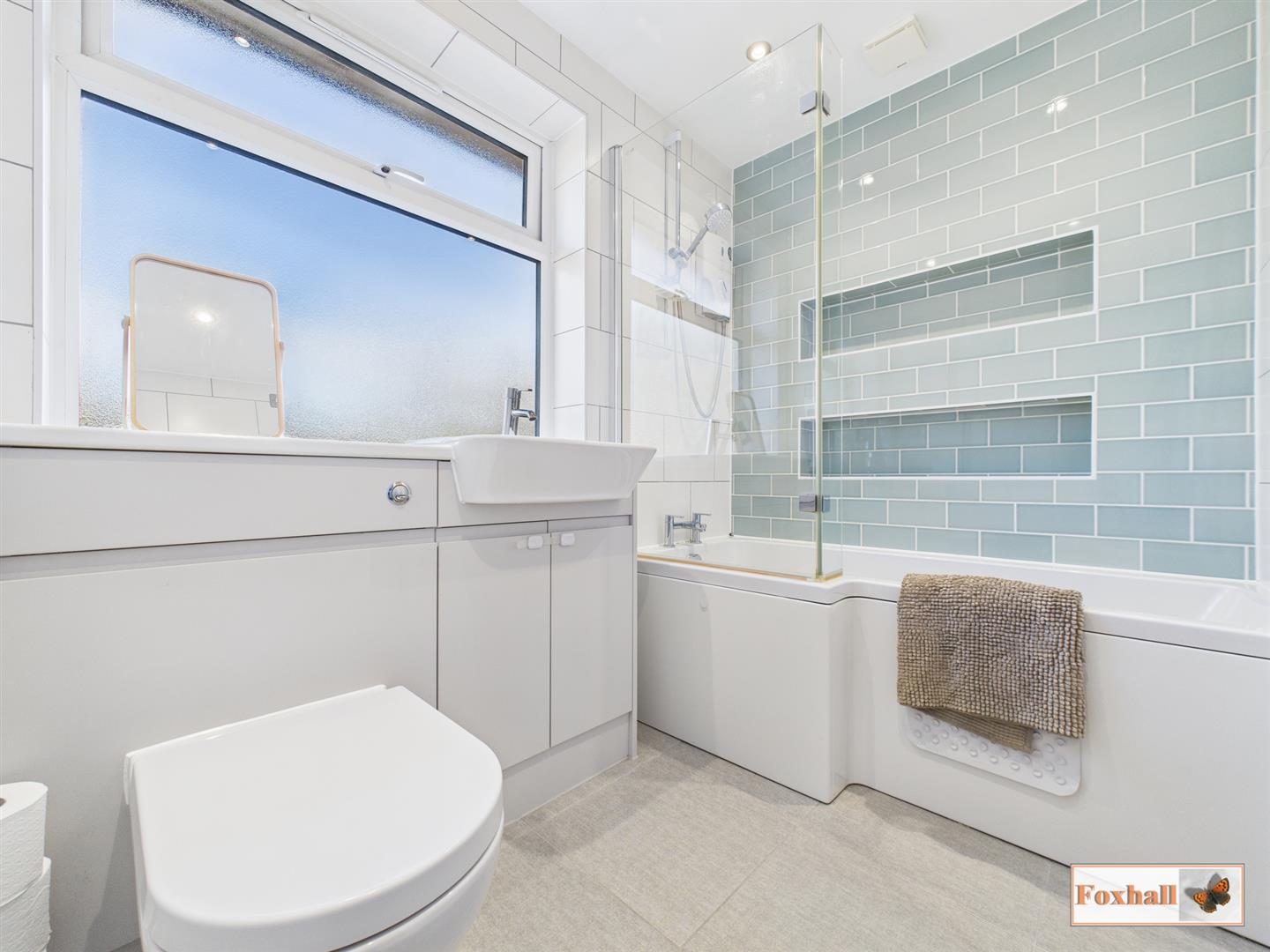 Bathroom - 2.31m x 1.65m (7'7" x 5'5") - Panel bath with stainless steel mixer taps, Mira Sport electric shower and glass shower screen, low-level W.C into vanity unit, hand wash basin into vanity unit, heated towel rail, side aspect frosted double glazed window, tiled walls and tiled flooring.
