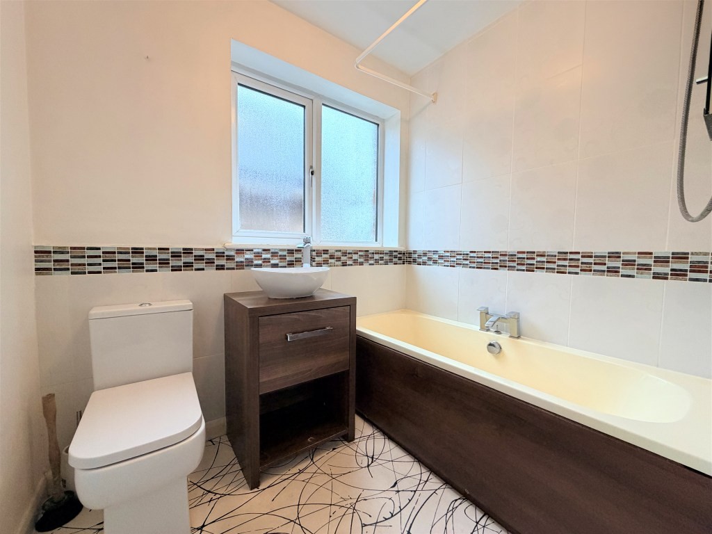 FAMILY BATHROOM Double glazed window to side, heated towel rail, panel bath with central mixer tap and electric shower over, bowl shaped hand wash basin with pedestal mixer tap set on fitted drawer unit, tiled splash backs, vinyl flooring, loft access.