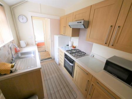 KITCHEN 9' 1" x 6' 6" (2.77m x 1.98m) Matching wall & base units with roll edge worktops, 4 ring gas hob with extractor over, gas oven, Stainless steel sink with swan neck mixer tap, washing machine to stay, fridge/freezer to remain, double glazed window to side aspect, vinyl floor covering, door to rear lobby area with shelved pantry, double glazed door to side aspect, door to bathroom.