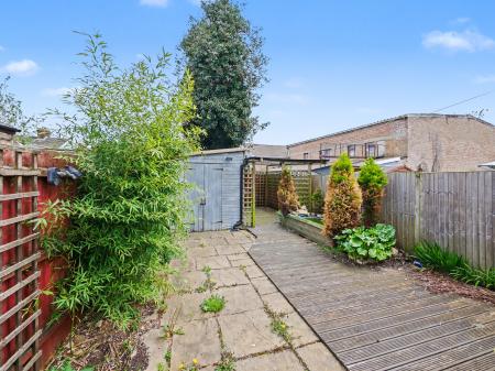 OUTSIDE Dwarf brick wall to front, blocked paved front garden, side pedestrian access to left hand side of property with gate into rear garden leading to deck area, pergola area, paving and timber garden storage shed all enclosed by fencing.