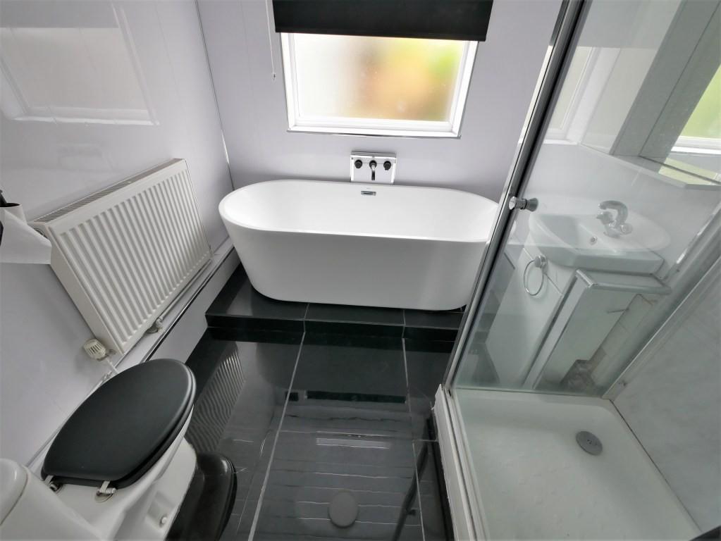 BATHROOM Comprising low level WC, wash hand basin, radiator, freestanding bath and shower cubicle, ceramic tiled flooring, double glazed window to rear aspect.