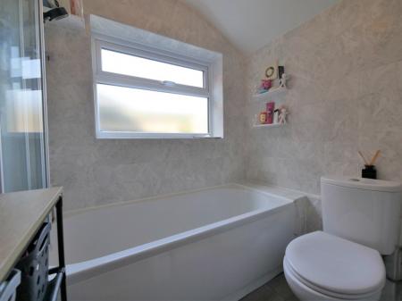 BATHROOM Obscured double glazed window to side, chrome heated towel rail, modern suite consisting of a panelled bath with miser tap and shower attachment, pedestal hand wash basin and low level WC, tiled walls and floor, extractor fan.