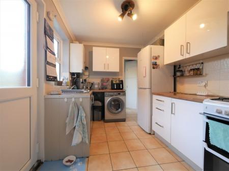 KITCHEN 7' 11" x 10' 1" approx. (2.41m x 3.07m) Double glazed window to side, a comprehensive range of modern base and eye level fitted cupboard and drawer units, wood effect work surfaces, inset stainless steel sink drainer unit with mixer tap, spaces for gas cooker, washing machine and dish-washer, wall mounted gas fired boiler, tiled splash backs and floor, door to rear lobby, double glazed side door opening to garden.
