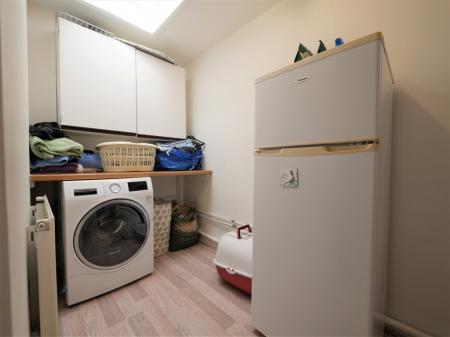 UTILITY ROOM 9' 6" x 5' 3" approx. (2.9m x 1.6m) Roof lantern, radiator, eye level fitted cupboards, work surface, wood effect flooring, spaces for fridge-freezer and washing machine, door to garage.
