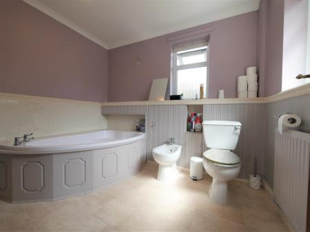 BATHROOM Obscure double glazed window to side and rear, radiator, panel spa style bath, double shower cubicle with electric shower, low level WC, pedestal hand-wash basin, bidet, tiled splash backs, niche recesses, tile effect flooring, extractor fan.