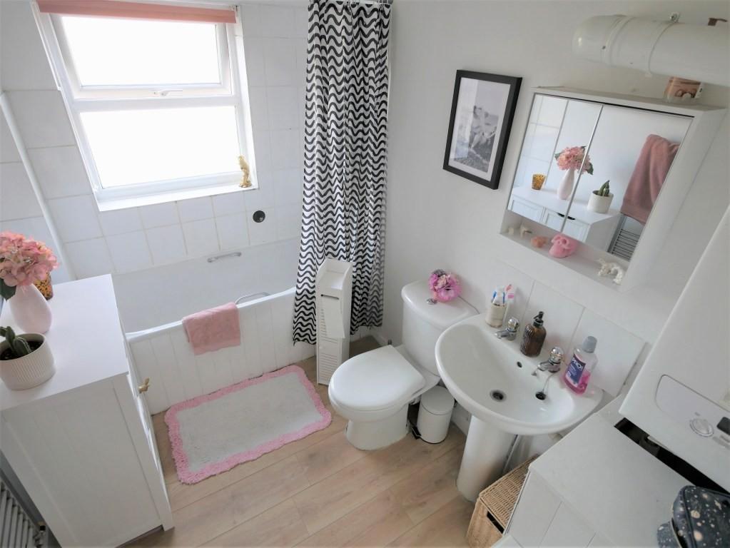 BATHROOM 9' 2" x 5' 11" (2.79m x 1.8m) Steps down to bathroom, comprising low level WC, wash hand basin and bath, double glazed window to rear aspect, LVT flooring, chrome heated towel rail, wall mounted Baxi boiler.