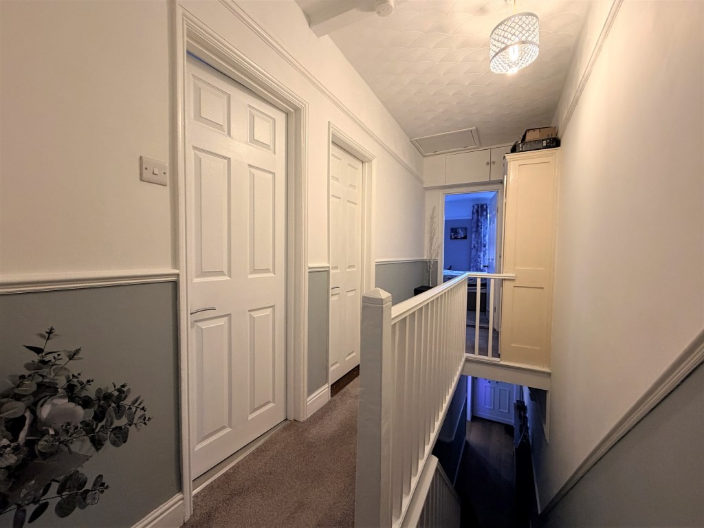LANDING Built-in cupboard, picture and dado rails, loft access hatch and drop down ladder to predominantly boarded loft space with light, doors to.