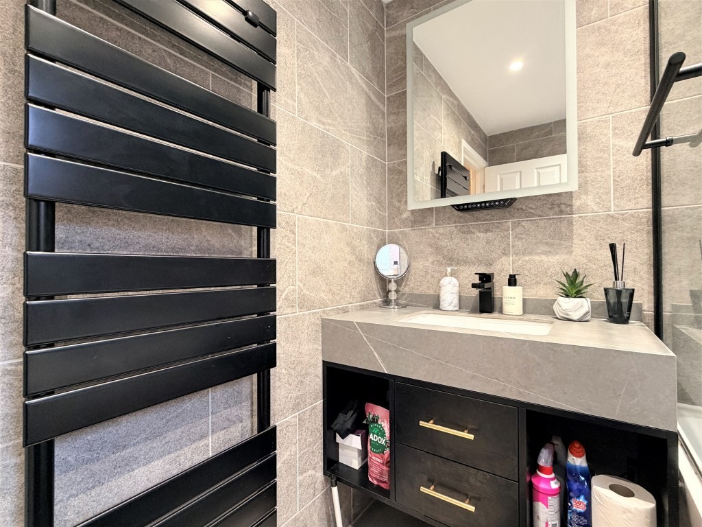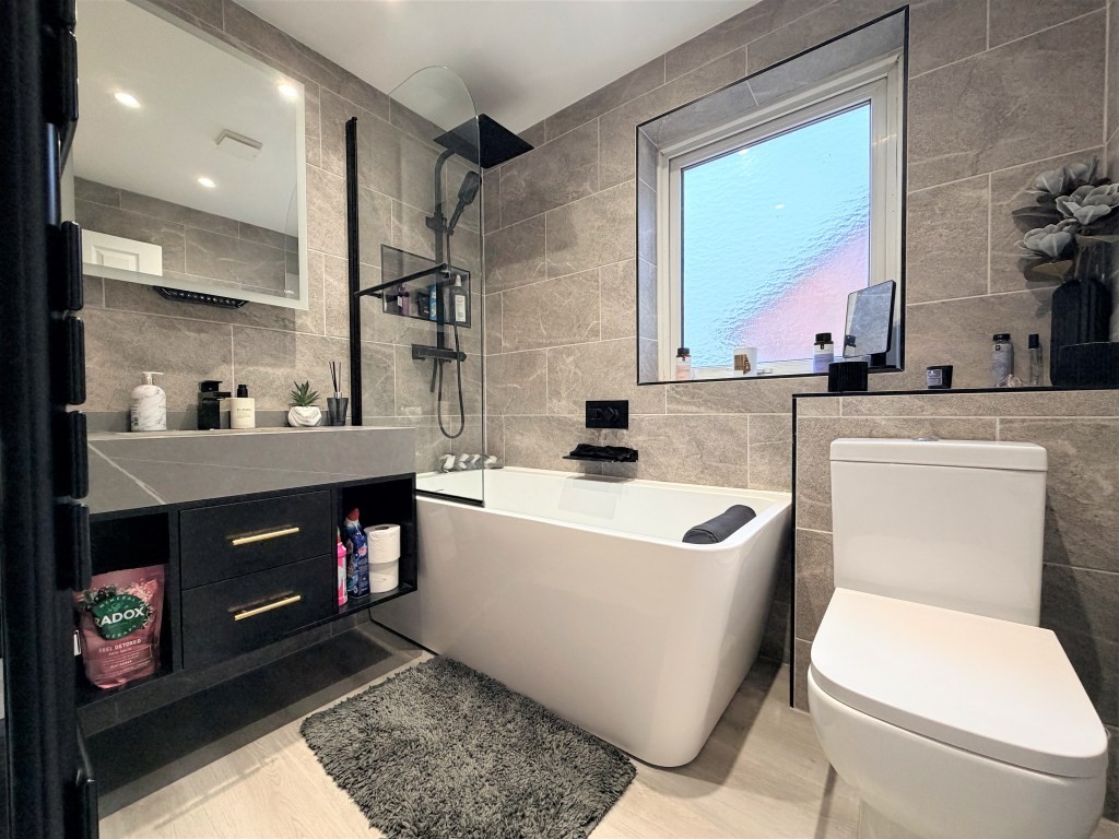 CONTEMPORARY BATHROOM Obscure double glazed window to side, heated towel rail, moulded bath with wall inset mixer tap and waterfall outlet, and fixed head thermostatic shower with separate rinser over, under mount hand wash basin with mixer tap and marble effect surface atop drawer and storage unit, low level WC, touch lit Bluetooth mirror with Alexa, stone effect tiled walls, inset ceiling lights, wood effect flooring, extractor fan