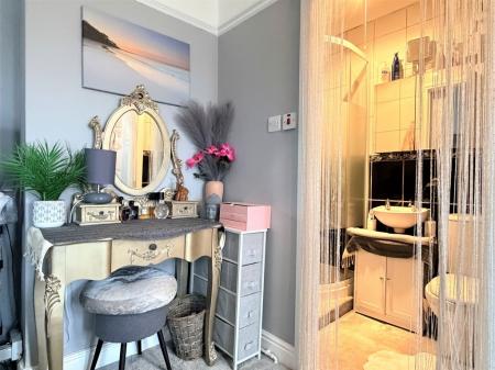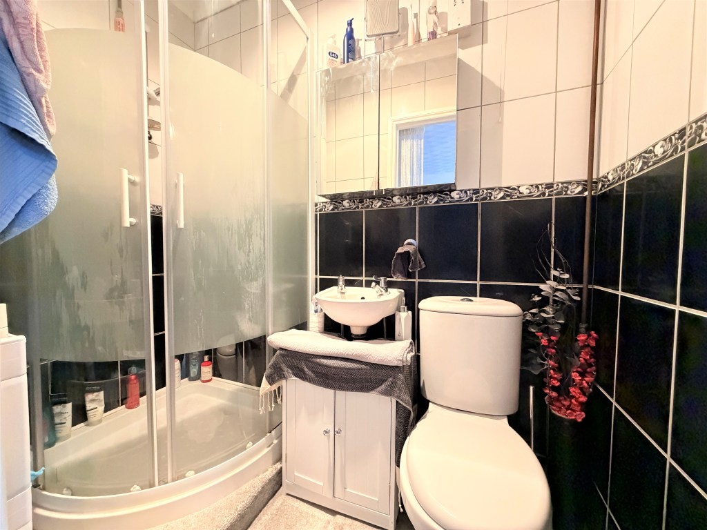 EN-SUITE SHOWER ROOM Shower cubicle with electric shower, wall mounted hand-wash basin, low level WC, fully tiled floor, heater-light, extractor fan.