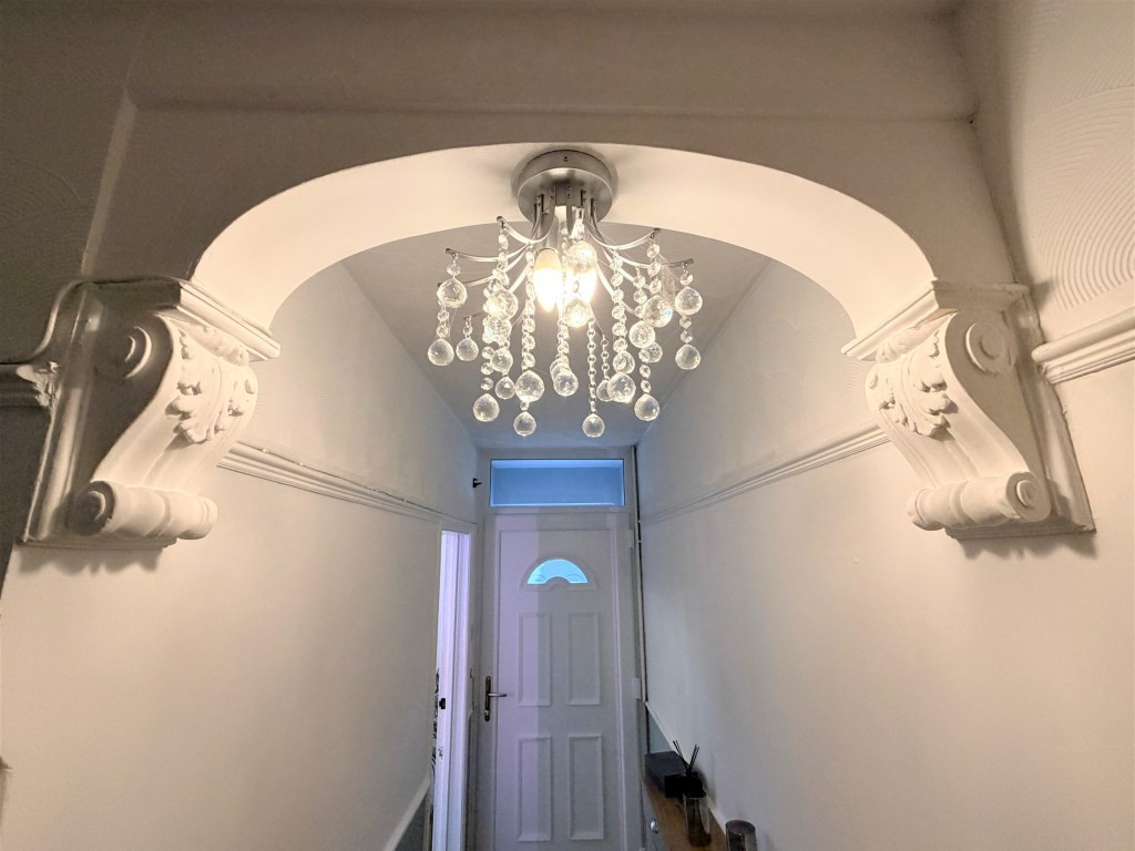 ENTRANCE HALL Radiator, decorative bookend archway, under stairs recess, picture and dado rails, stairs rising to first floor, natural wood flooring, doors to.