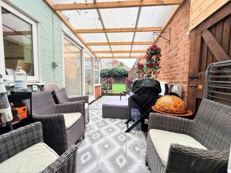 CONSERVATORY 9' 3" x 10' 7" approx. (2.82m x 3.23m) Double glazed to three aspects with sloping UPVC roof and two top opening windows, tiled floor, mains power and lighting, sliding patio style doors opening to sheltered external entertainment space.