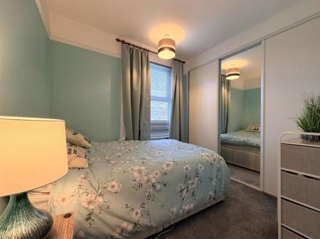 BEDROOM THREE 11' to back of wardrobe x 7' 9" approx. plus recess. (3.35m x 2.36m) Double glazed window to rear, radiator, built-in triple wardrobe, built-in airing cupboard.