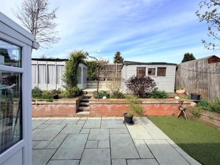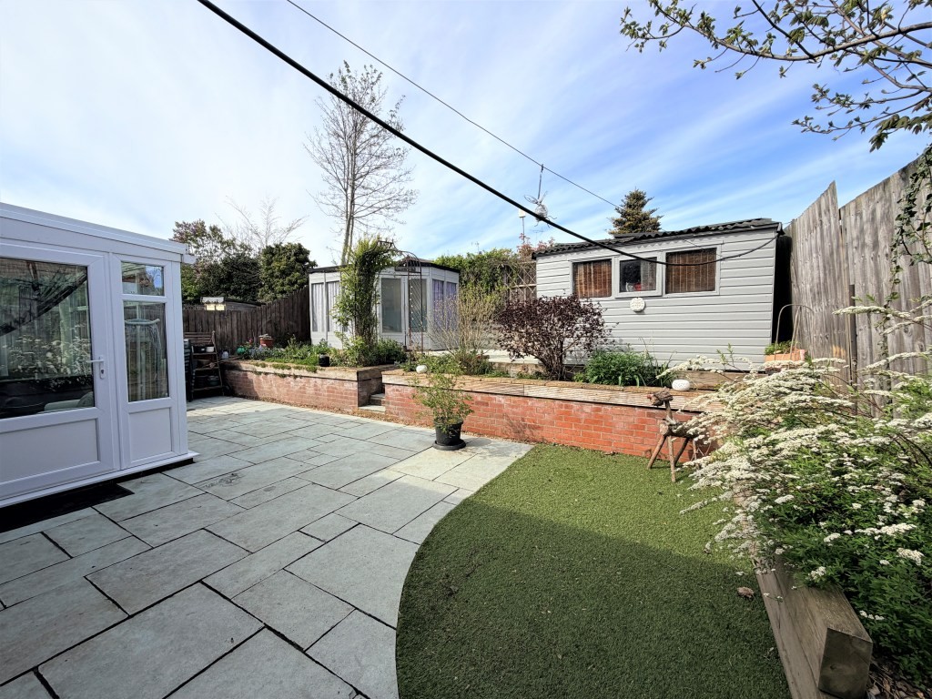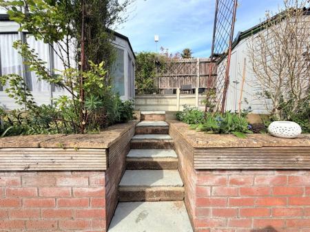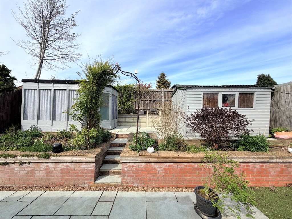 OUTSIDE A pleasant approach arrives at an open frontage which provides driveway parking and steps up to the front door and roof top outlook, furthermore, there's an additional allocated and visitor parking space and external tap. A side gate to the rear reveals and impressive two tier landscaped wrap around fence enclosed garden with ample Indian Stone entertainment patio, artificial lawn, timber retained raised flower beds, steps up to an elevated brick retained sun-trap Indian Stone patio positioned between a wooden summerhouse and shed which will remain.
