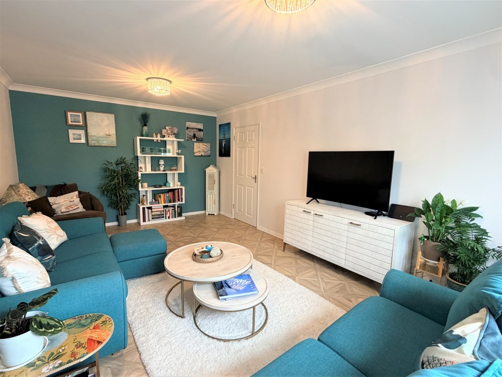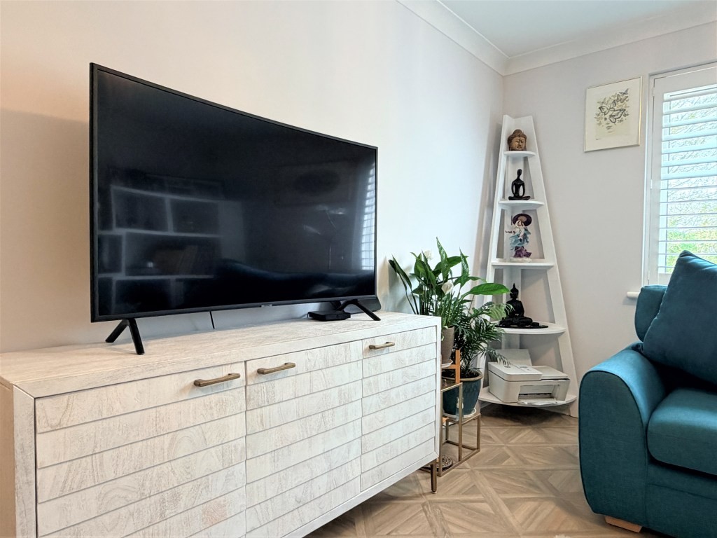 SITTING ROOM 19' 4" x 11' 9" approx. (5.89m x 3.58m) Double glazed window with fitted plantation blinds to front, radiator, television and broadband points, patterned wood effect laminate flooring.