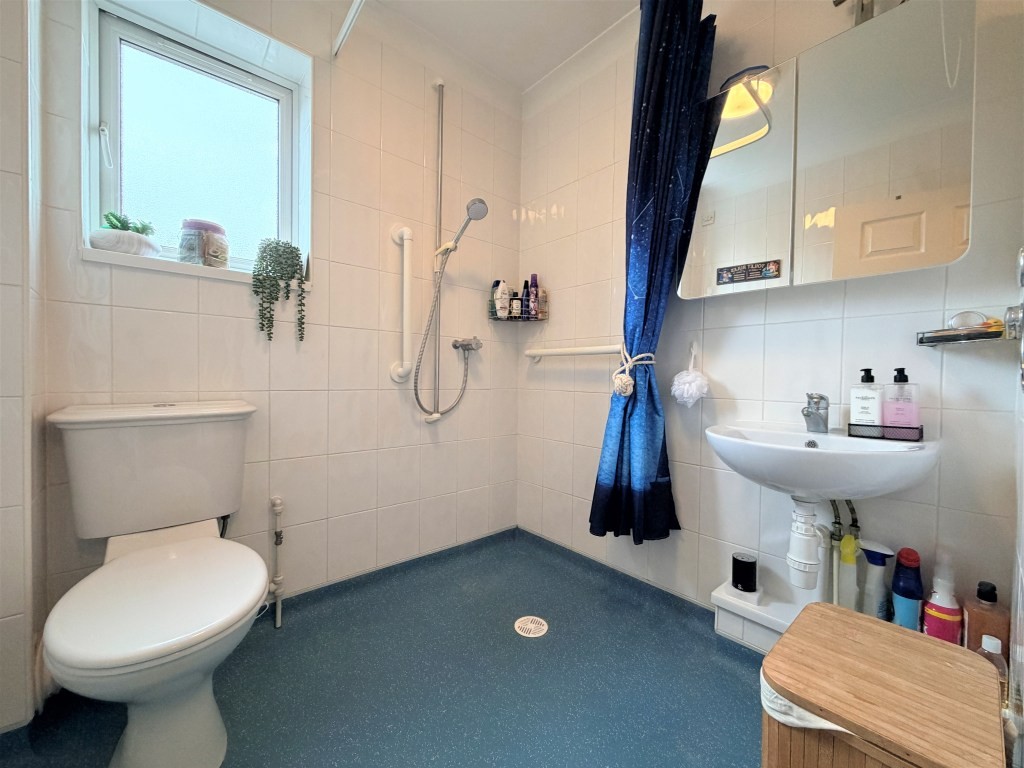 WET ROOM Obscure double glazed window to side, chrome heated towel rail, thermostatic shower over self draining heavy duty vinyl flooring, wall mounted hand-wash basin with mixer tap, low level WC, fully tiled walls, extractor fan.