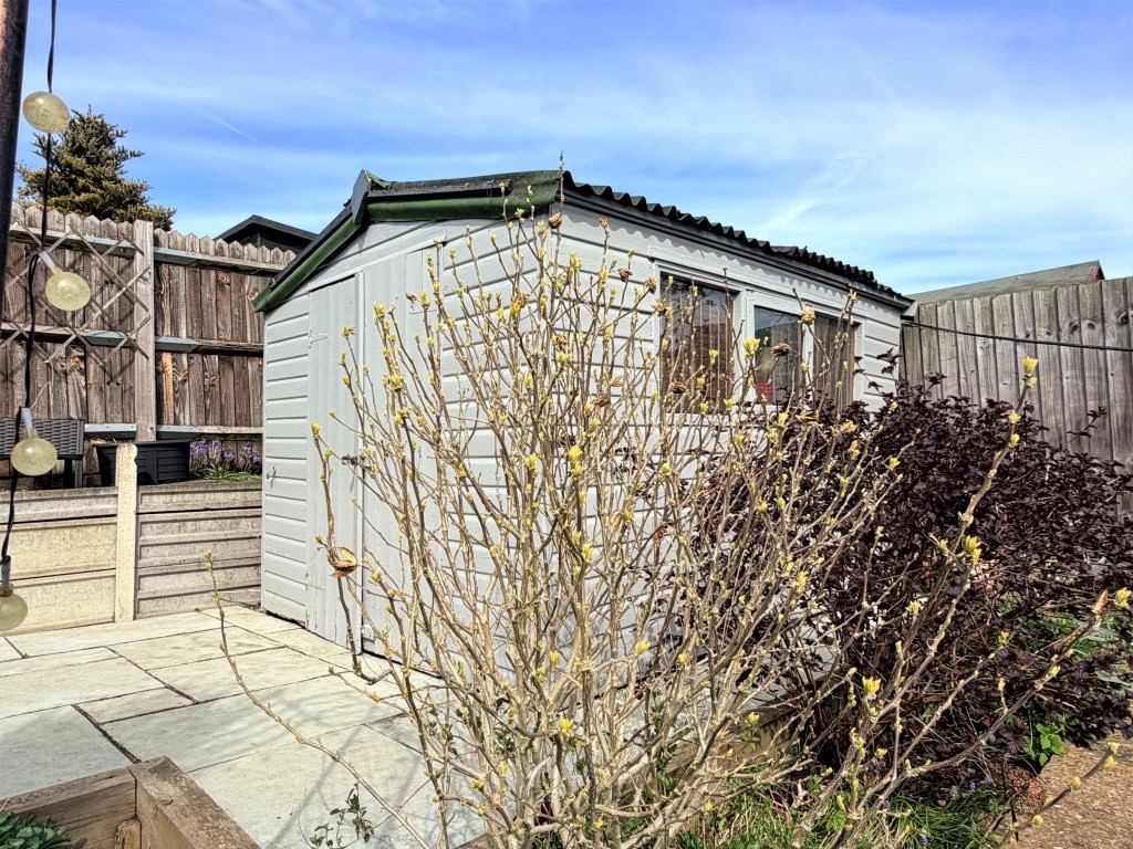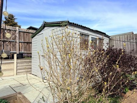 SHED 9' 9" x 7' 9" approx. (2.97m x 2.36m) Three windows to front, double door entry, mains power connected.