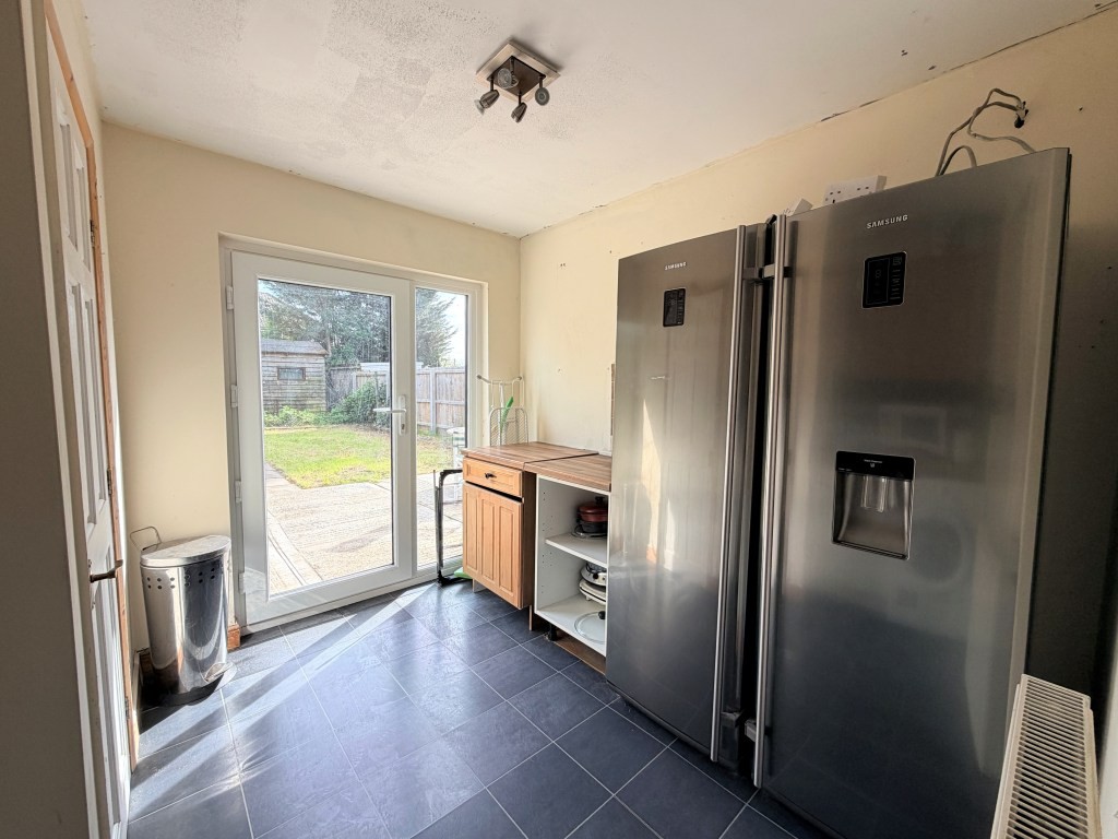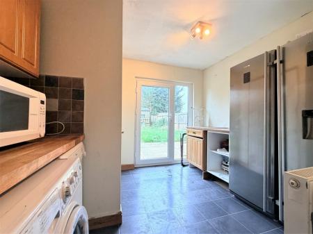 BREAKFAST/UTILITY ROOM 10' 2" x 9' 1" approx. (3.1m x 2.77m) Double glazed French doors opening to garden, radiator, natural wood and wood effect work surfaces, tiled splash backs, washing machine, dish-washer and fridge freezer spaces, tile effect flooring, door to WC.
