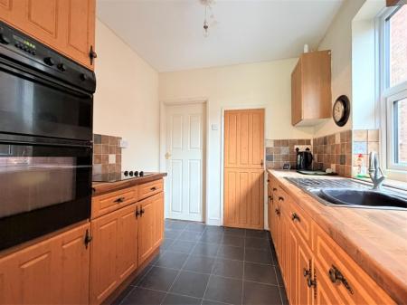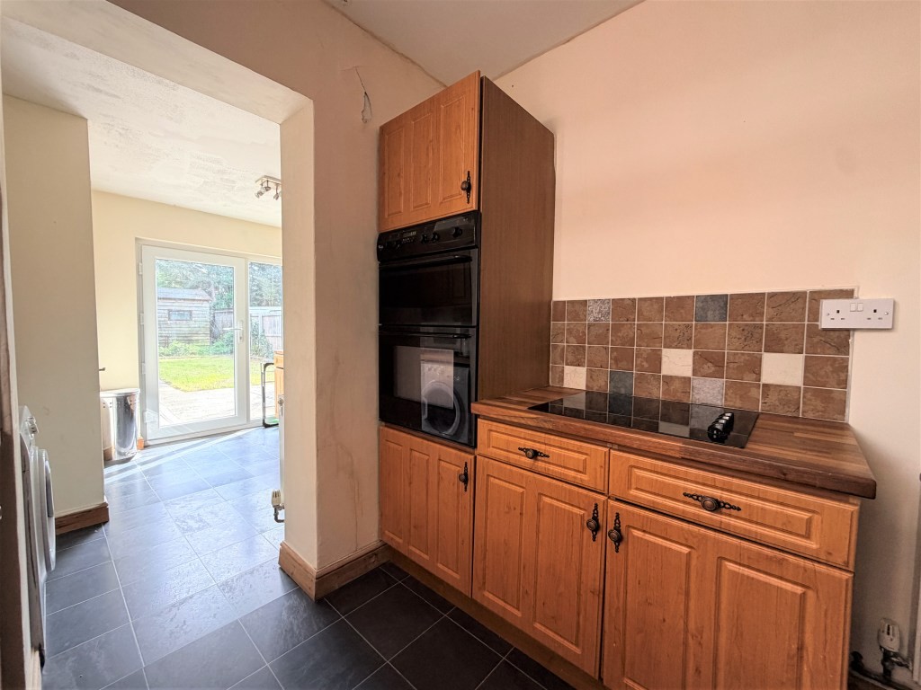 KITCHEN 8' x 8' 5" approx. (2.44m x 2.57m) Double glazed window to side, a comprehensive range of base and eye level fitted cupboard and drawer units, natural wood work surfaces, stainless steel sink drainer unit with mixer tap, tiled splash backs, built-in oven and grill, inset electric hob, built-in cupboard housing wall mounted gas fired boiler, opening to breakfast/utility room. The refrigerator and freezer are available by separate negotiation.