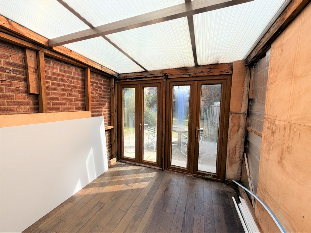 GARDEN ROOM 8' 6" x 10' 3" approx. (2.59m x 3.12m) In need of completion/repair. Double glazed twin doors and side casements to rear opening to garden, natural wood flooring.
