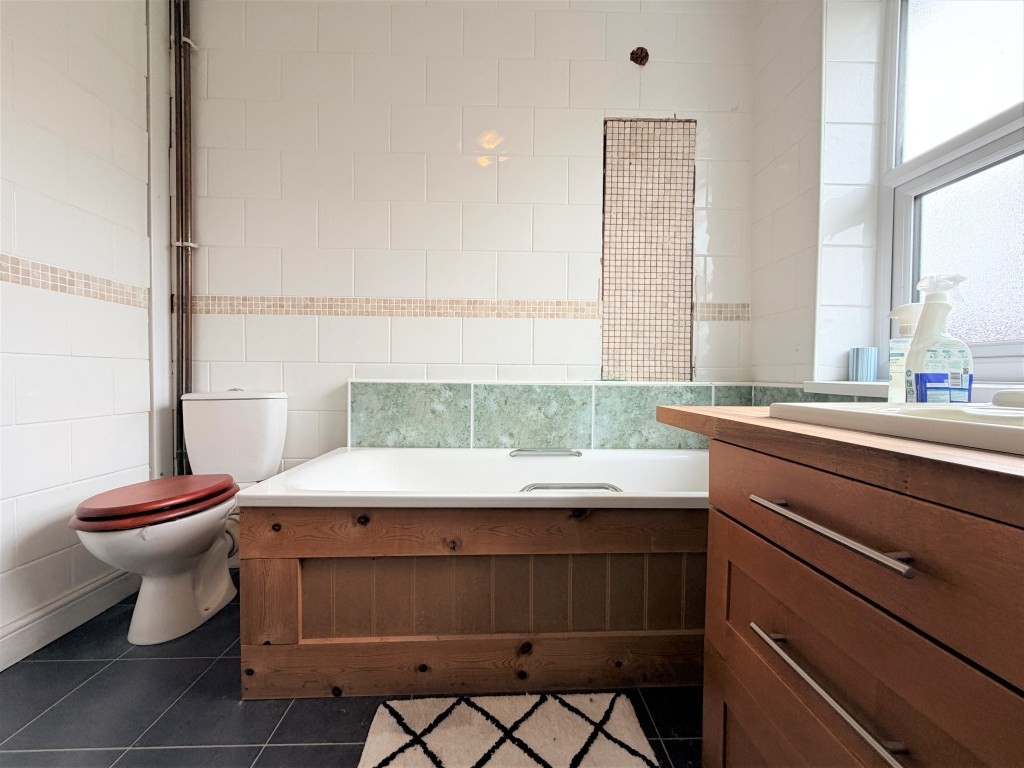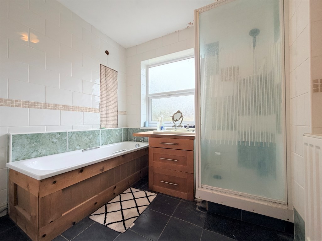 FAMILY FOUR PIECE BATHROOM Obscure double glazed window to rear, radiator, panel bath, shower cubicle with thermostatic shower, mounted hand-wash basin atop natural wood work surface with drawer units under, low level WC, tiled walls, tile effect flooring, loft access hatch.