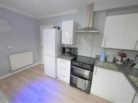 KITCHEN 12' 11" x 8' 2" (3.94m x 2.49m) Modern fitted kitchen comprising glossy fronted wall and base units with roll edge work tops, Cooker with gas hob and electric oven with stainless steel extractor hood over, space for fridge/freezer, plumbing for washing machine, space for tumble dryer, stainless steel sink & drainer with hot & cold taps, double glazed window and door to rear aspect, radiator, door into dining room.