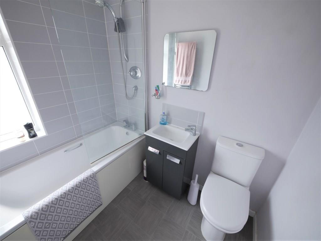 BATHROOM Comprising low level WC, wash hand basin with cupboard space under, bath with shower over (off the mains) extractor fan, chrome heated towel rail, vinyl floor covering.