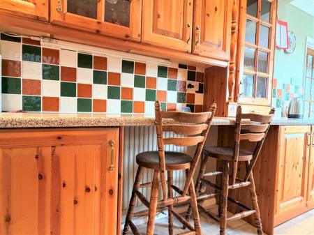 KITCHEN 7' 11" x 22' max. approx. (2.41m x 6.71m) Double glazed window to rear through to conservatory, double glazed window to side, radiator, an extensive range of natural wood base and eye level fitted cupboard and drawer units, granite effect work surfaces and breakfast bar, inset composite sink drainer unit with mixer tap, tiled splash backs, built-in double oven, inset electric hob with extractor fan over, spaces for washing machine and fridge, tile effect flooring, door to lounge area and utility room.