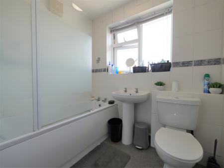 BATHROOM Double glazed window to front, radiator, white three piece suite comprising; low level WC, pedestal hand wash basin and panelled bath with shower over, tiled walls.