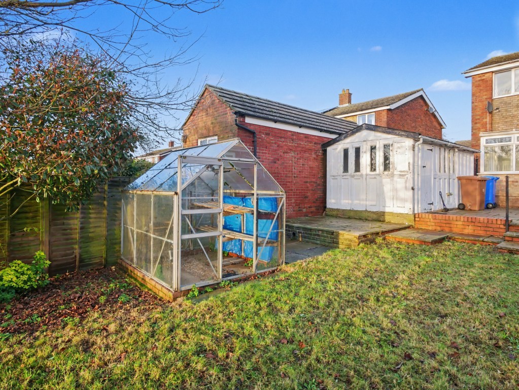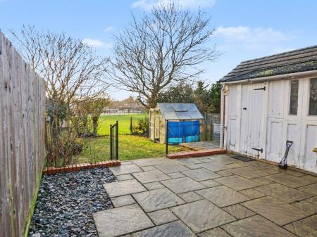 OUTSIDE Block paved off road parking to front plus driveway leading to detached garage, lawn to front, gate leading to rear garden onto patio area, step down to awn area, green house, views overlooking school playing field to rear, all enclosed by fencing.