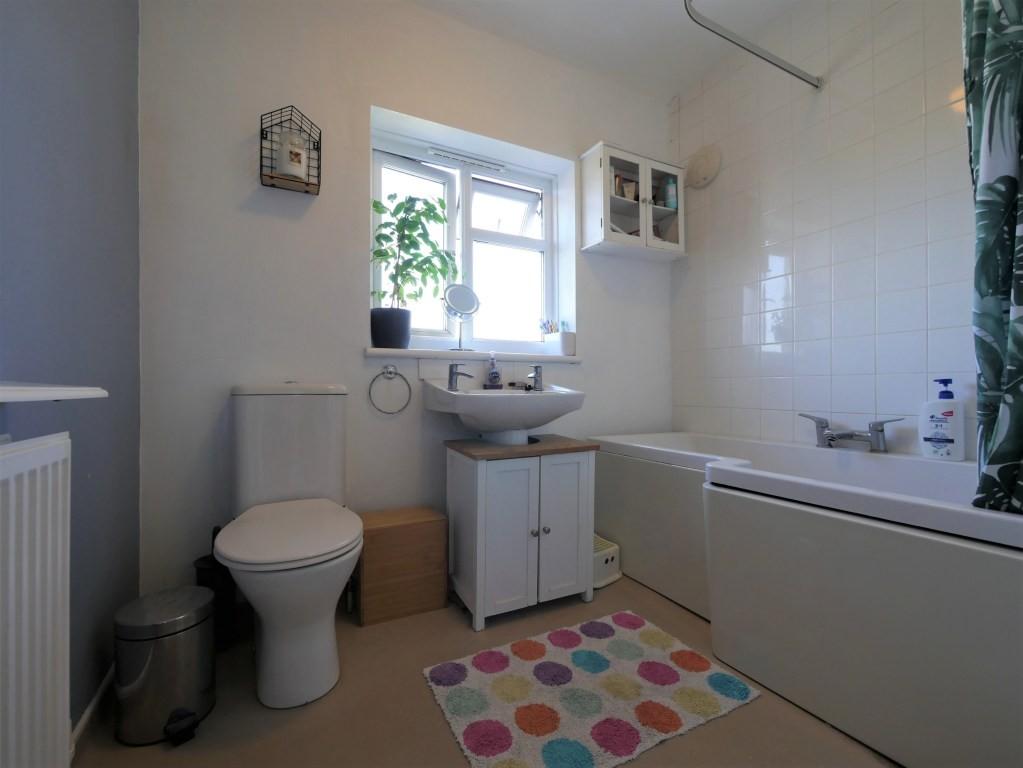 BATHROOM  Obscure double glazed window to rear, radiator, shaped shower bath with central mixer and electric shower over, pedestal hand-wash basin, low level WC, tiled splash backs, vinyl flooring, extractor fan.