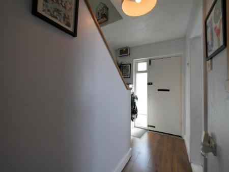 ENTRANCE HALL  Wood effect flooring, radiator, stairs with wood panelling feature rising to first floor, doors to.