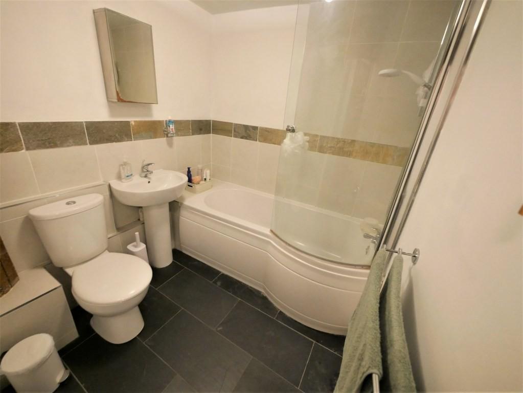 BATHROOM Comprising low level WC, wash hand basin and bath with electric shower over, extractor fan, ceiling fan, tiled flooring and storage cupboard