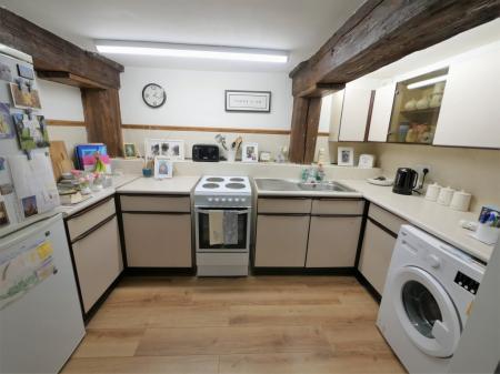 KITCHEN 11' 1" x 6' 7" (3.38m x 2.01m) Comprising matching wall & base units with roll edge work tops, electric cooker, ceiling beams, plumbing for washing machine, space for fridge/freezer, hard wood flooring.