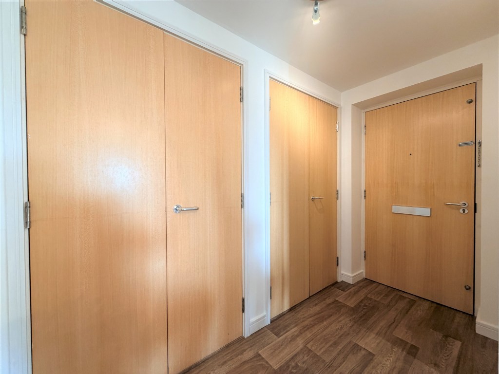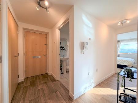 PRIVATE HALLWAY Under floor heating, twin built-in double cupboards, one housing the hot water tank, wall mounted intercom entry system, wood effect flooring, doors to.