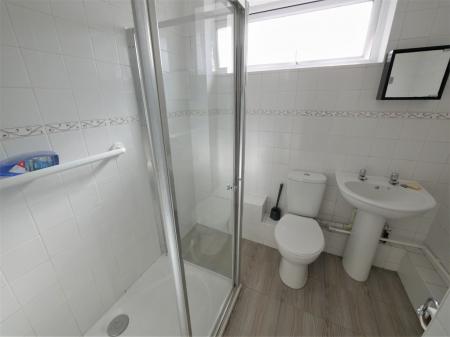 SHOWER ROOM Comprising low level WC, wash hand basin and shower cubicle with electric shower, double glazed window to front aspect, chrome heated towel rail, laminate flooring, floor to ceiling tiled walls.