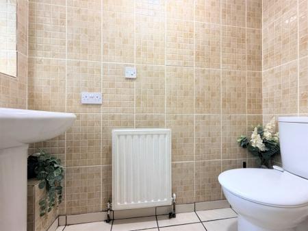 CLOAKROOM Obscure double glazed window to side, radiator, low level C, pedestal hand-wash basin with mixer tap, stone effect tiled walls, tiled floor.