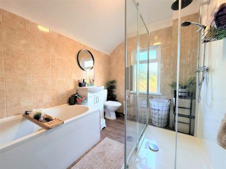 FOUR PIECE BATHROOM 9' 10" x 6' 10" approx. (3m x 2.08m) Obscure double glazed window to rear, heated towel rail, panel bath with mixer tap and shower attachment, double shower glazed cubicle with thermostatic shower, mounted hand-wash basin with mixer tap and cupboard unit under, low level WC, stone effect fully tiled walls, wood effect flooring, extractor fan.