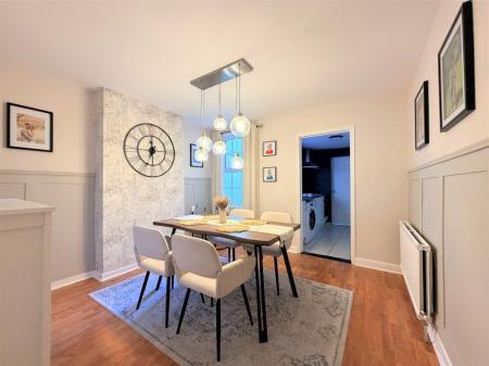 DINING ROOM 11' 1" x 11' 3" approx. (3.38m x 3.43m) Double glazed window to rear, radiator, recess with under stairs cupboard, part panelled walls, opening through to kitchen.