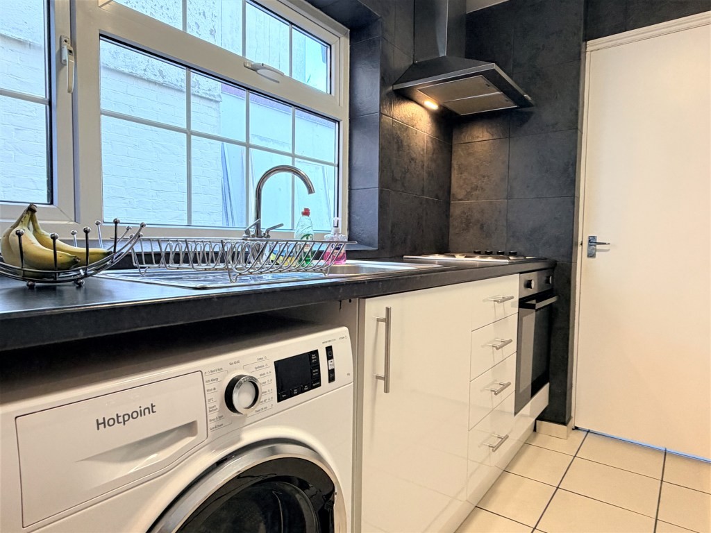 KITCHEN 9' 10" x 6' 10" approx. (3m x 2.08m) Double glazed window to side, a contemporary range of base and eye level gloss fronted fitted cupboard and drawer units, granite effect work surfaces, stainless steel sink drainer unit with mixer tap, built-in electric oven and grill with inset electric hob and stainless steel extractor hood over, under counter space for washing machine, slate effect tiled splash backs, tiled floor, door to rear lobby.