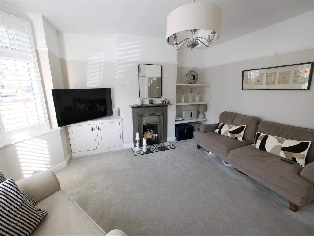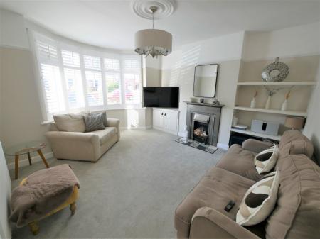 LOUNGE 13' 2" x 12' 2" (4.01m x 3.71m) Carpeted flooring, school style radiator, double glazed bay window to front aspect with plantation shutters, shelved recess, storage cupboards in other recess, traditional cast iron fireplace.