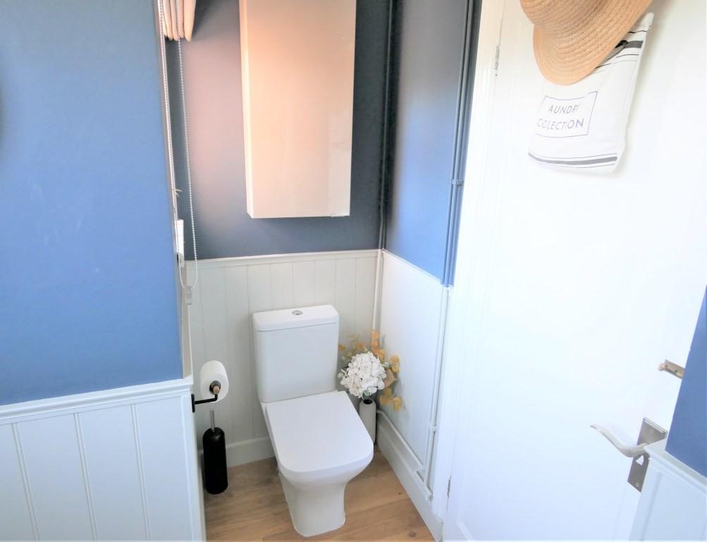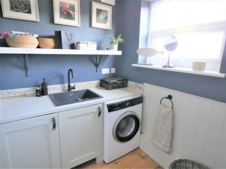UTILITY/CLOAKROOM 9' 3" max x 6' 2" max (2.82m x 1.88m) Low level WC, worktop with inset sink swan neck mixer tap, plumbing for washing machine, slimline wall radiator, engineered hard wood flooring, 2 double glazed windows to rear aspect.