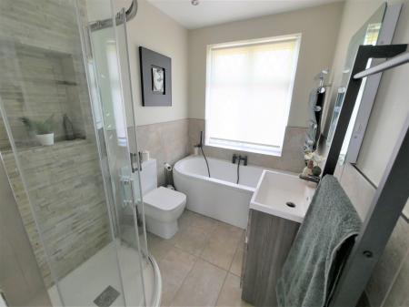 BATHROOM 7' 11" x 6' (2.41m x 1.83m) Modern fitted low level WC, wash hand basin with storage cupboards under, bath with mixer shower attachment, shower cubicle, half tiled walls, tiled flooring, extractor fan, modern style chrome heated towel rail, double glazed window to front aspect.
