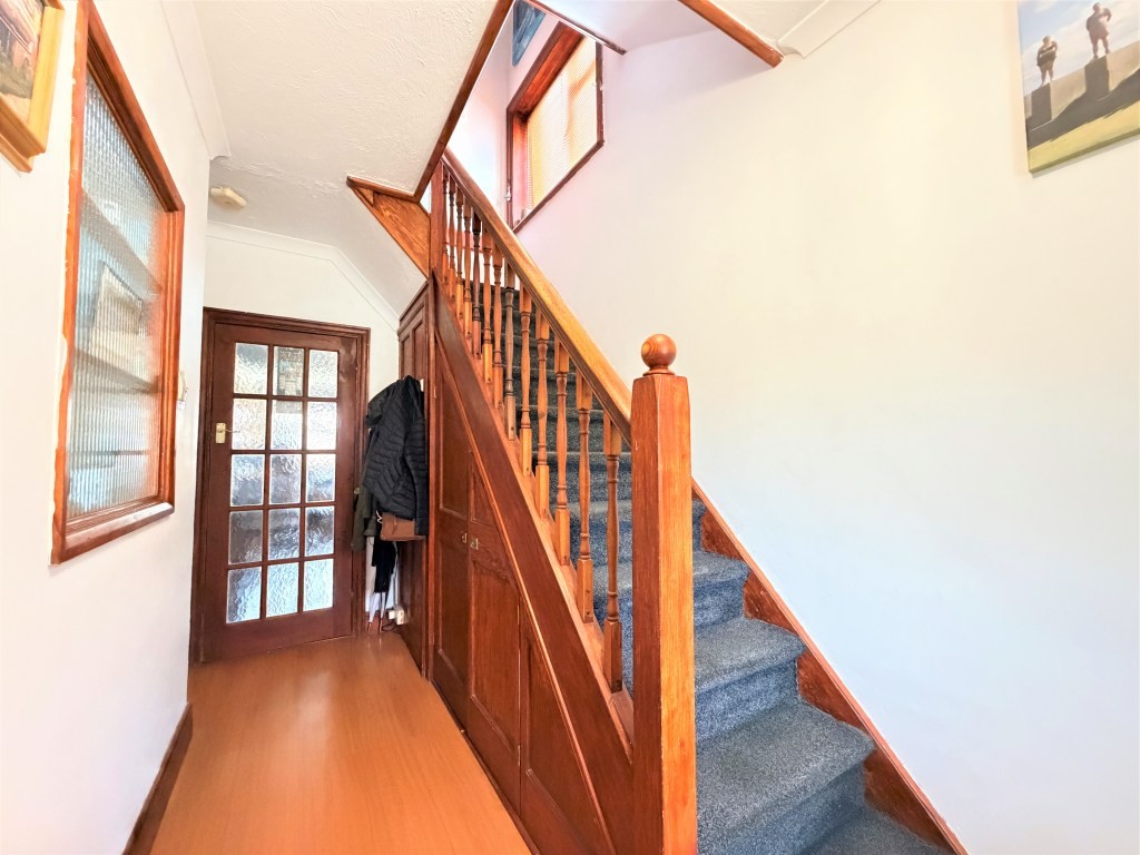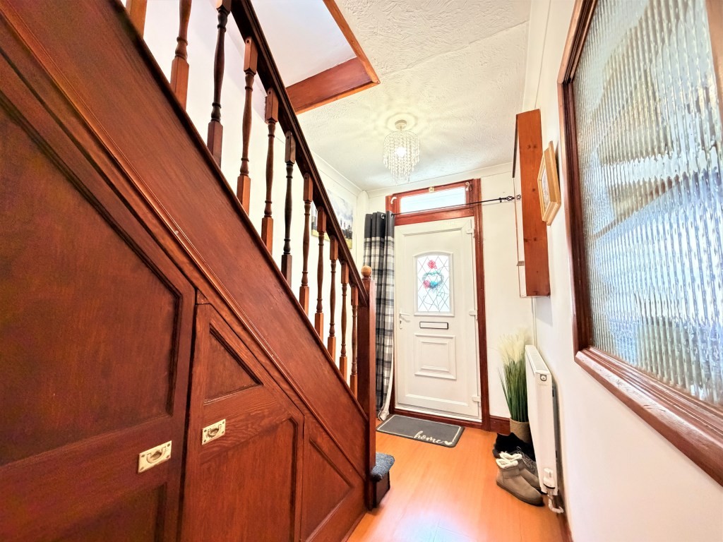 ENTRANCE HALL Radiator, under stairs shelved cupboard, stairs with traditional style spindle railed banister rising to first floor, wood effect flooring, doors to.