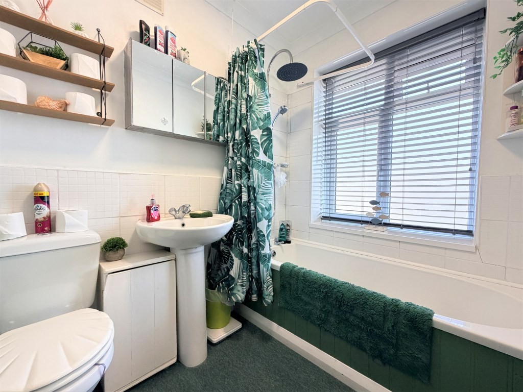 FAMILY BATHROOM Obscured double glazed window to front, radiator, low level WC, pedestal hand-wash basin with mixer tap, panel bath with electric fixed head shower and separate rinser, part wood panelled wall, tiled splash backs, extractor fan.