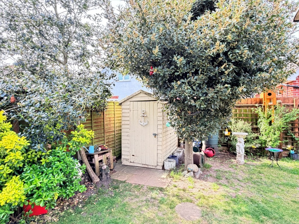 OUTSIDE The property is nicely set back from the road by a railed paved frontage with wide side driveway. Double gates provide vehicle access to the rear which reveals a substantial garage and workshop with double door entry measuring approximately 10' 3" x 28' 11", and an attractive garden, mainly laid to established lawn with stocked flower beds, wooden shed, external tap and lighting.