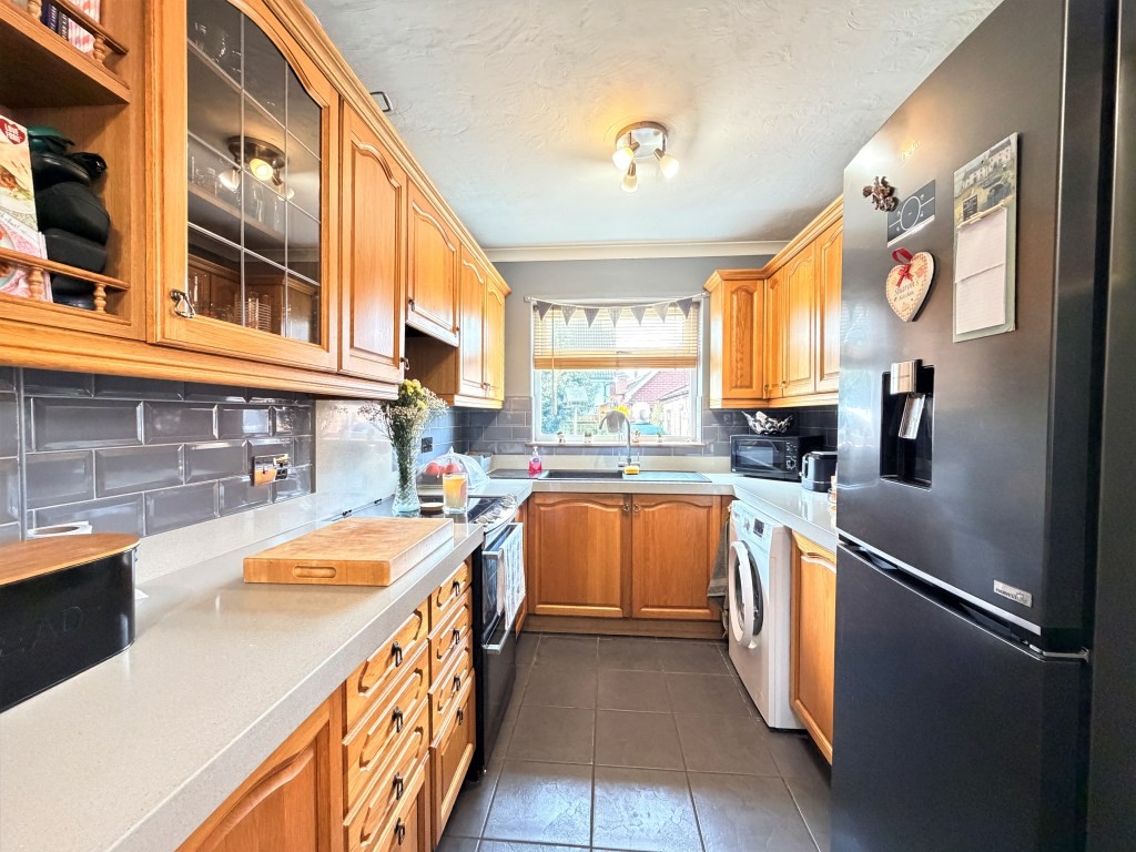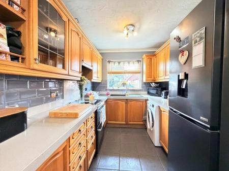 KITCHEN/BREAKFAST ROOM 8' 1" x 15' 11" approx. (2.46m x 4.85m) Double glazed windows to side and rear, radiator, a comprehensive range of natural wood fronted fitted cupboard, drawer and display cabinet units, solid granite work surfaces with peninsular breakfast bar extending, inset composite sink drainer unit with mixer tap, existing cooker and fridge freezer negotiable by separate arrangement, space for washing machine, metro style tiled splash backs, tiled floor, double glazed side door opening out to side driveway, service hatch through to dining room.