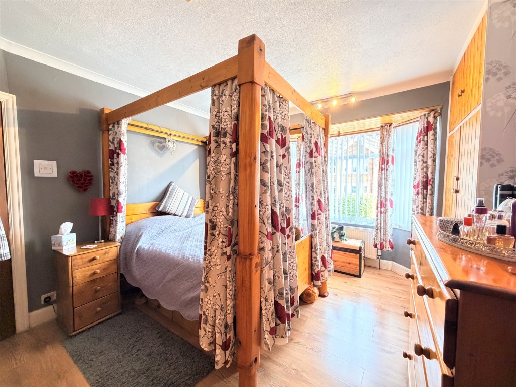 BEDROOM ONE 12' 2" x 11' 11" approx. (3.71m x 3.63m) Double glazed bay window to front, radiator, two built-in wardrobes into alcoves, wood effect flooring.